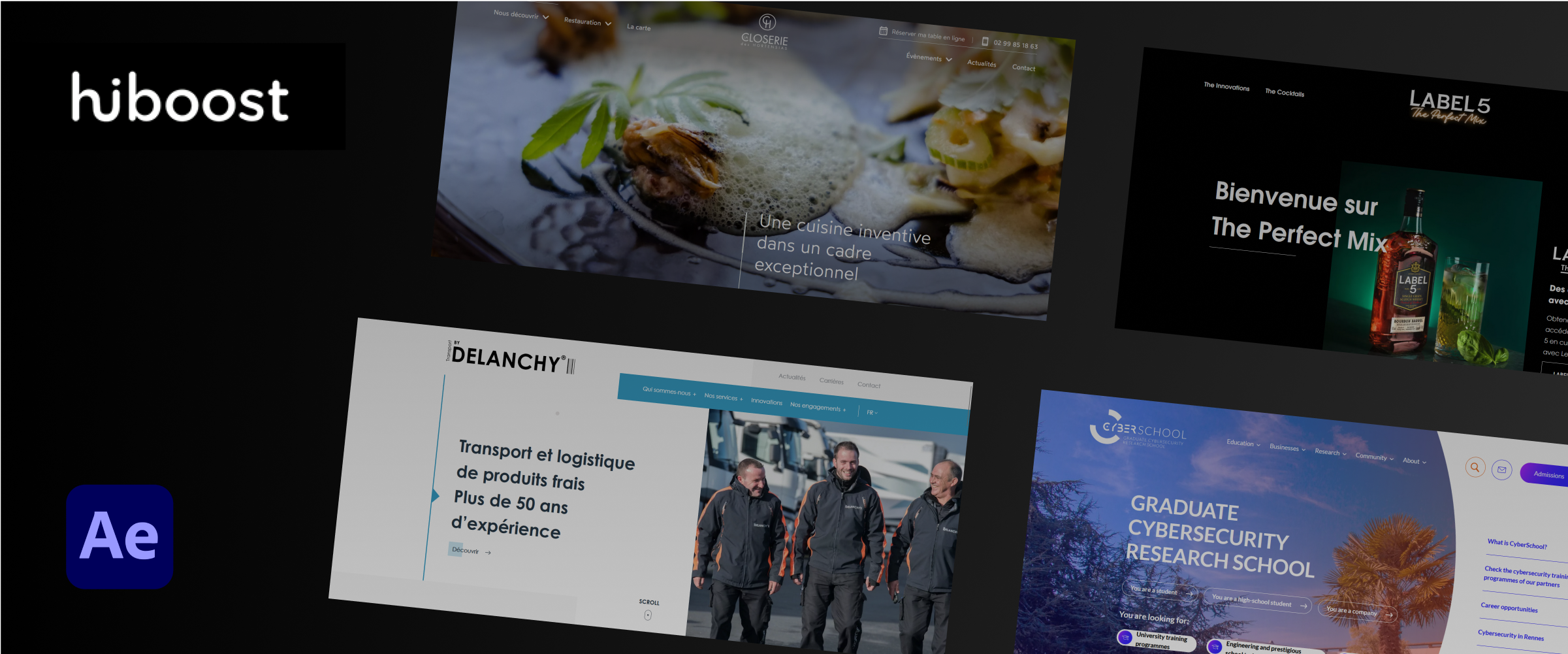 Pour la nouvelle année 2023, j'ai eu l'occasion de réaliser le showreel de l'agence Hiboost. L'objectif était de mettre en lumière de manière dynamique certaines des réalisations de l'agence, et de présenter en quelques secondes les domaines d'expertise d'Hiboost. Ce showreel a été réalisé sur After Effects et il est disponible sur la page Réalisations du site d'Hiboost.